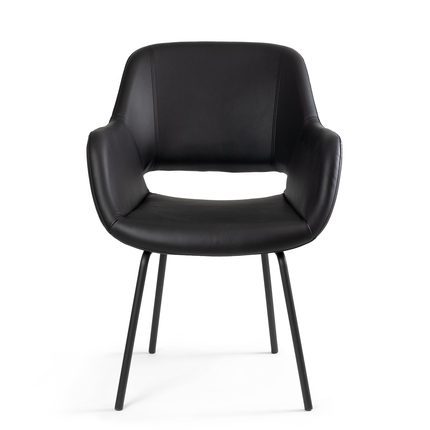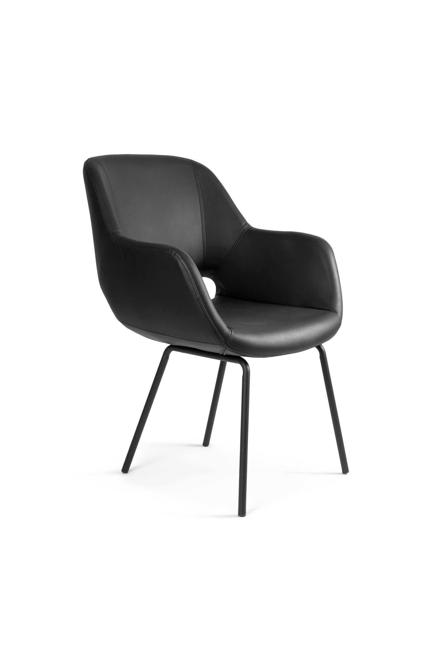 Su diseño envolvente con brazos integrados mejora la experiencia del usuario, mientras que la base metálica de cuatro patas aporta estabilidad y durabilidad en entornos de uso comercial.
