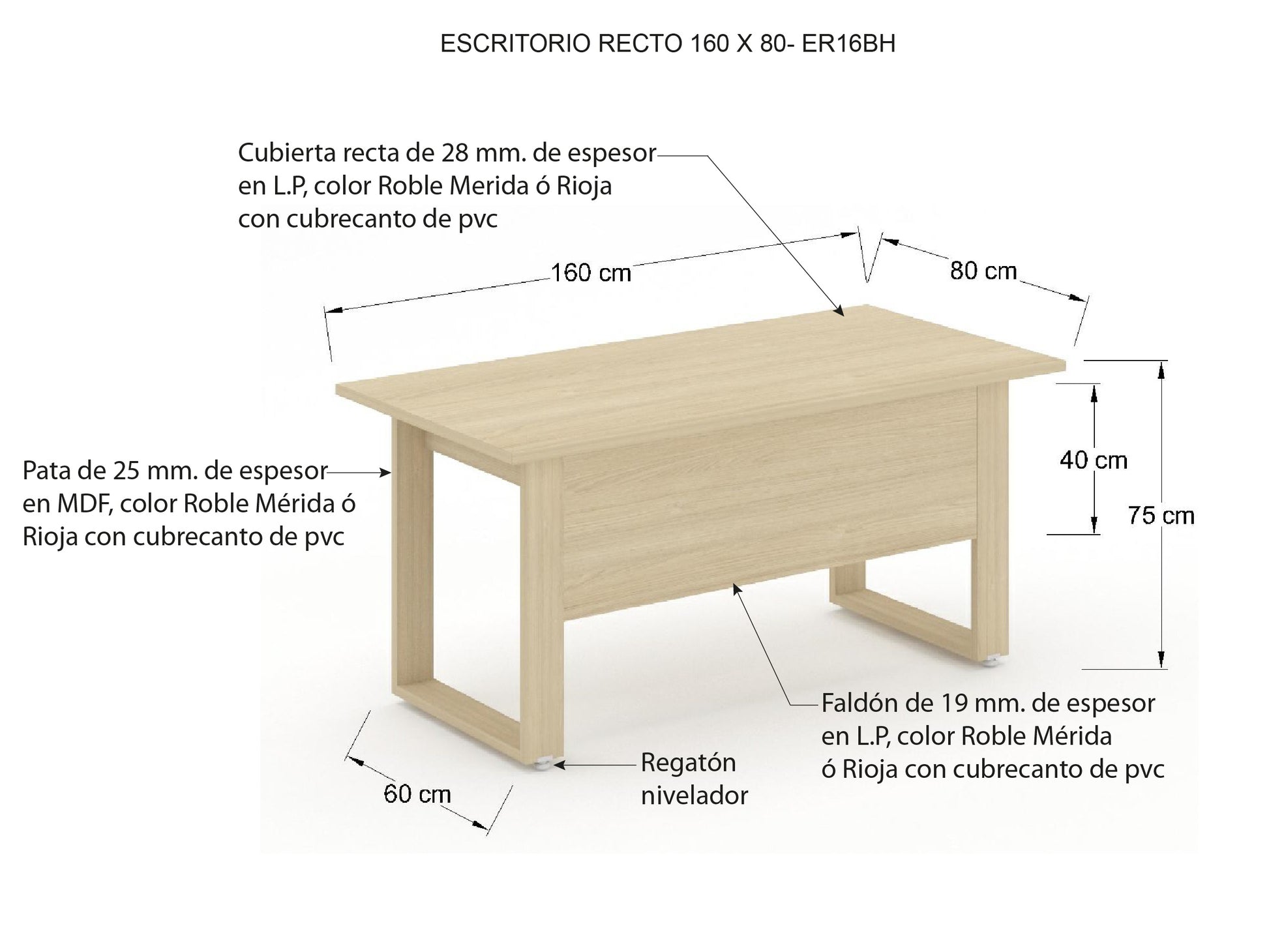 - Todo el escritorio fabricado a un mismo color, Roble Mérida (C) o Rioja (H).