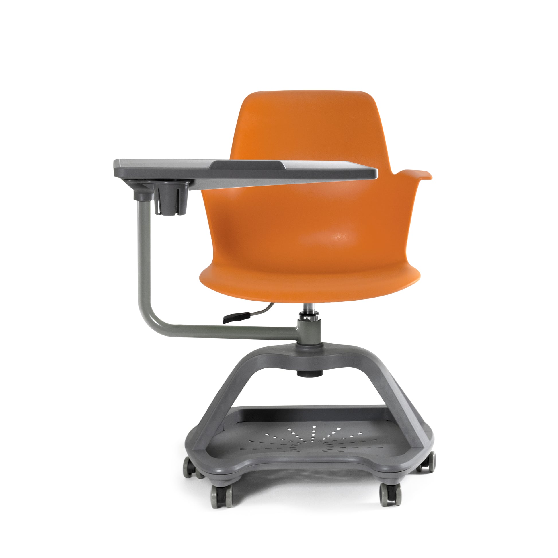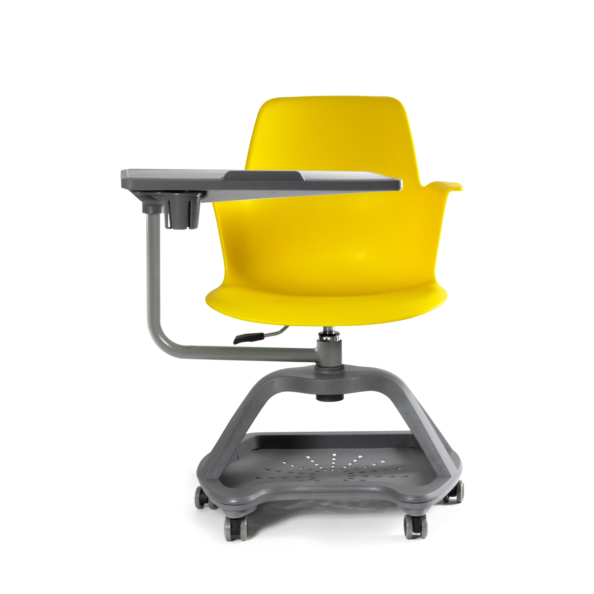 Su concha de polipropileno de alta durabilidad con paleta integrada permite tomar notas o usar dispositivos sin necesidad de escritorio adicional. La base giratoria con charola inferior y seis rodajas certificadas BIFMA facilita el movimiento y la organización del espacio.