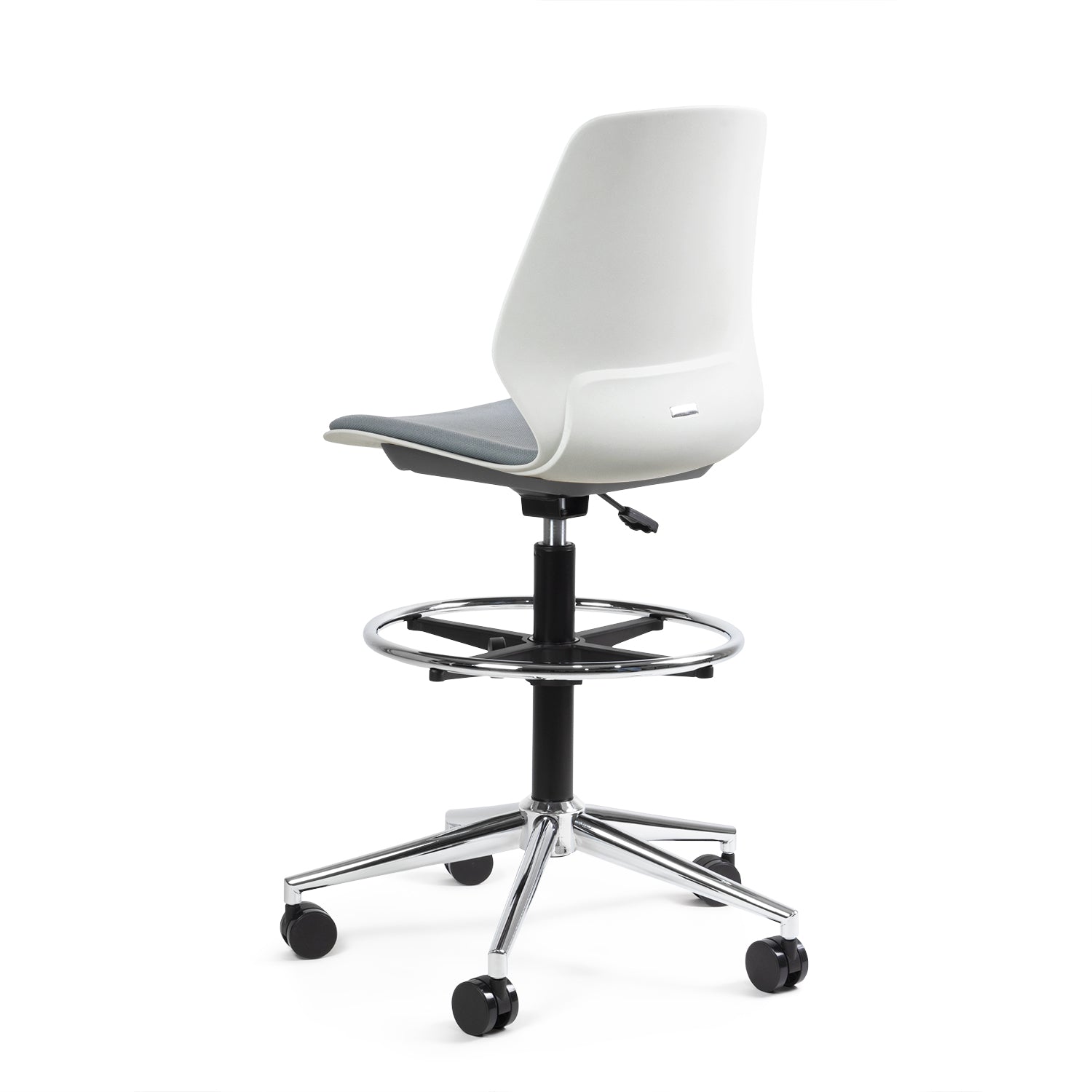 Incorpora asiento tapizado tela color Gris, estructura de polipropileno de una sola pieza y base cromada de 24” con certificación BIFMA. Su pistón clase 3 y aro descansa pies cromado garantizan estabilidad y soporte en entornos industriales, comerciales y contract.