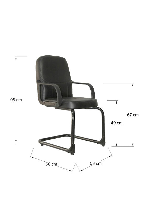 Tapizada en piel sintética negra, con brazos de polipropileno y estructura metálica en acabado negro, ofrece resistencia y comodidad en cualquier espacio corporativo.”