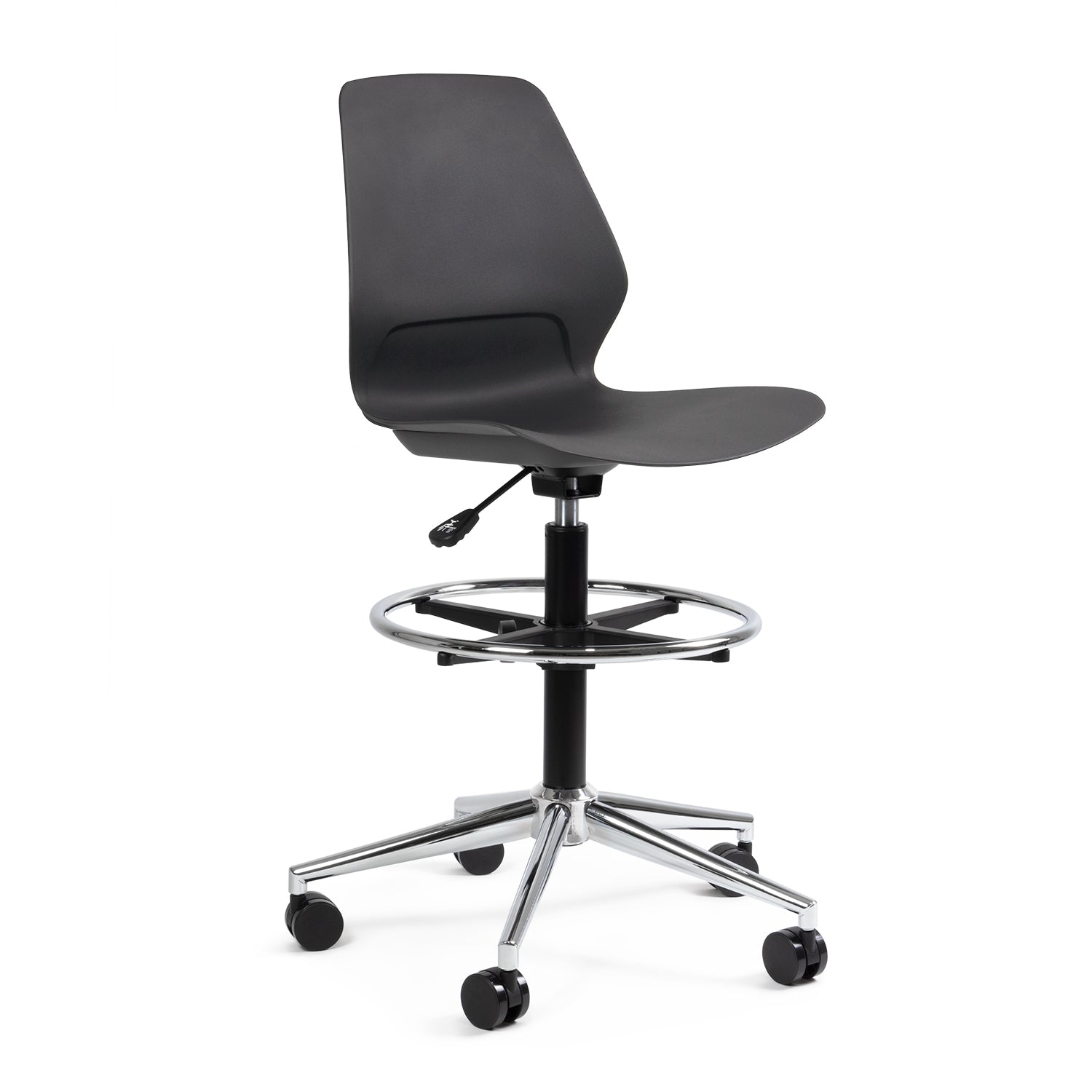 Incorpora base cromada con pistón de gas, aro reposapiés y ruedas, ofreciendo estabilidad, funcionalidad y durabilidad certificada BIFMA.