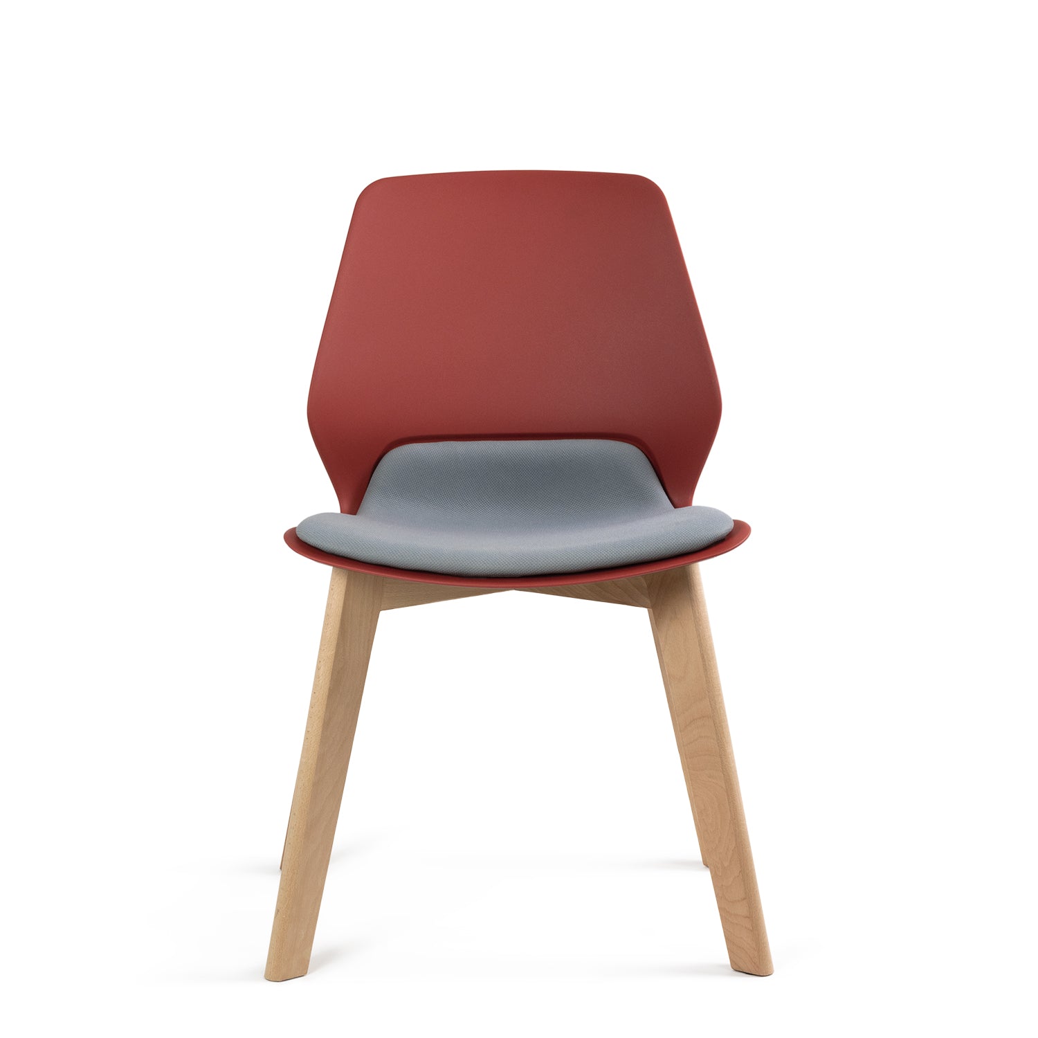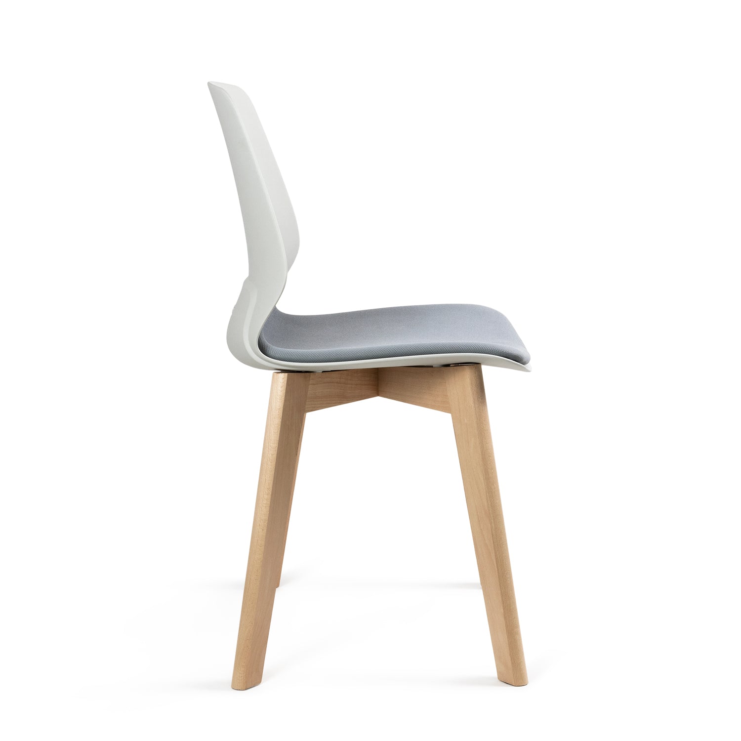 Su asiento y respaldo de polipropileno de alta durabilidad, complementados con cojín tapizado en tela gris, ofrecen confort visual y funcional en estancias cortas. La base de cuatro patas en madera maciza de roble aporta estabilidad y una estética cálida ideal para proyectos comerciales y corporativos.