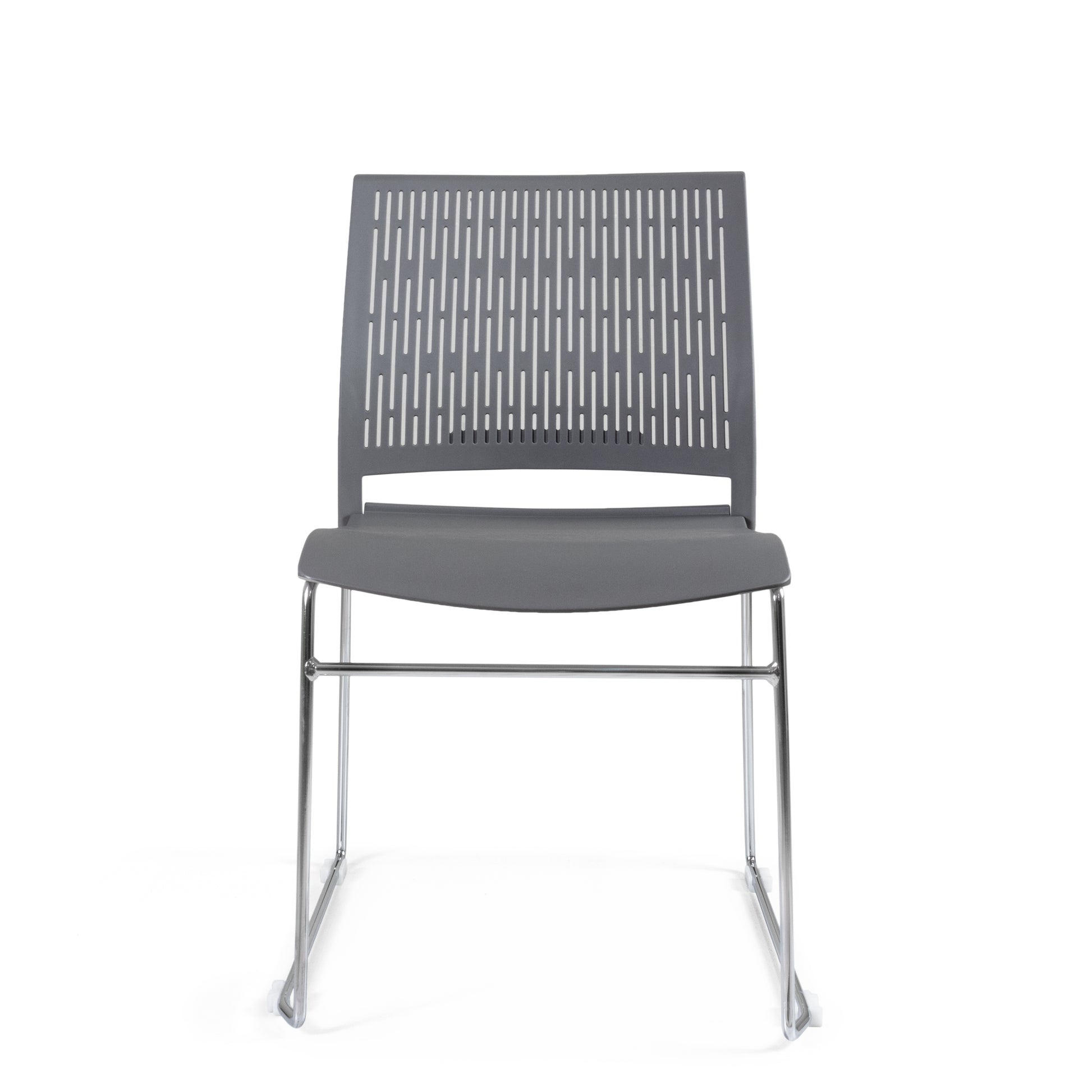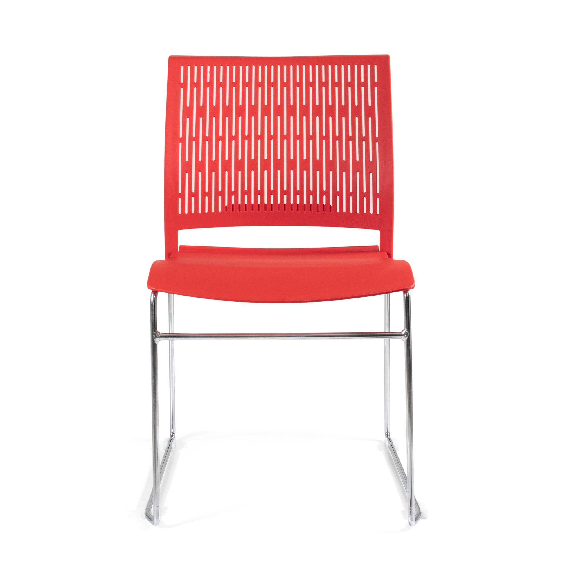 La silla multiusos Cerdeña combina una concha de polipropileno ventilado con una base tipo trineo cromada que aporta estabilidad y movilidad ligera, ideal para espacios de uso intensivo.