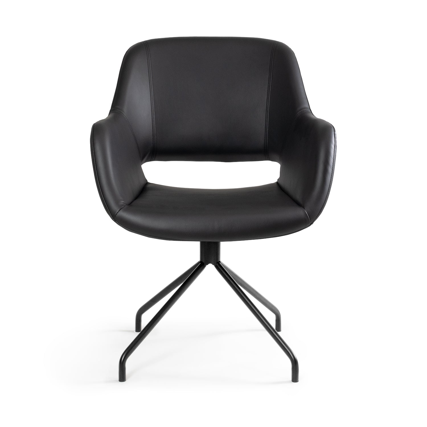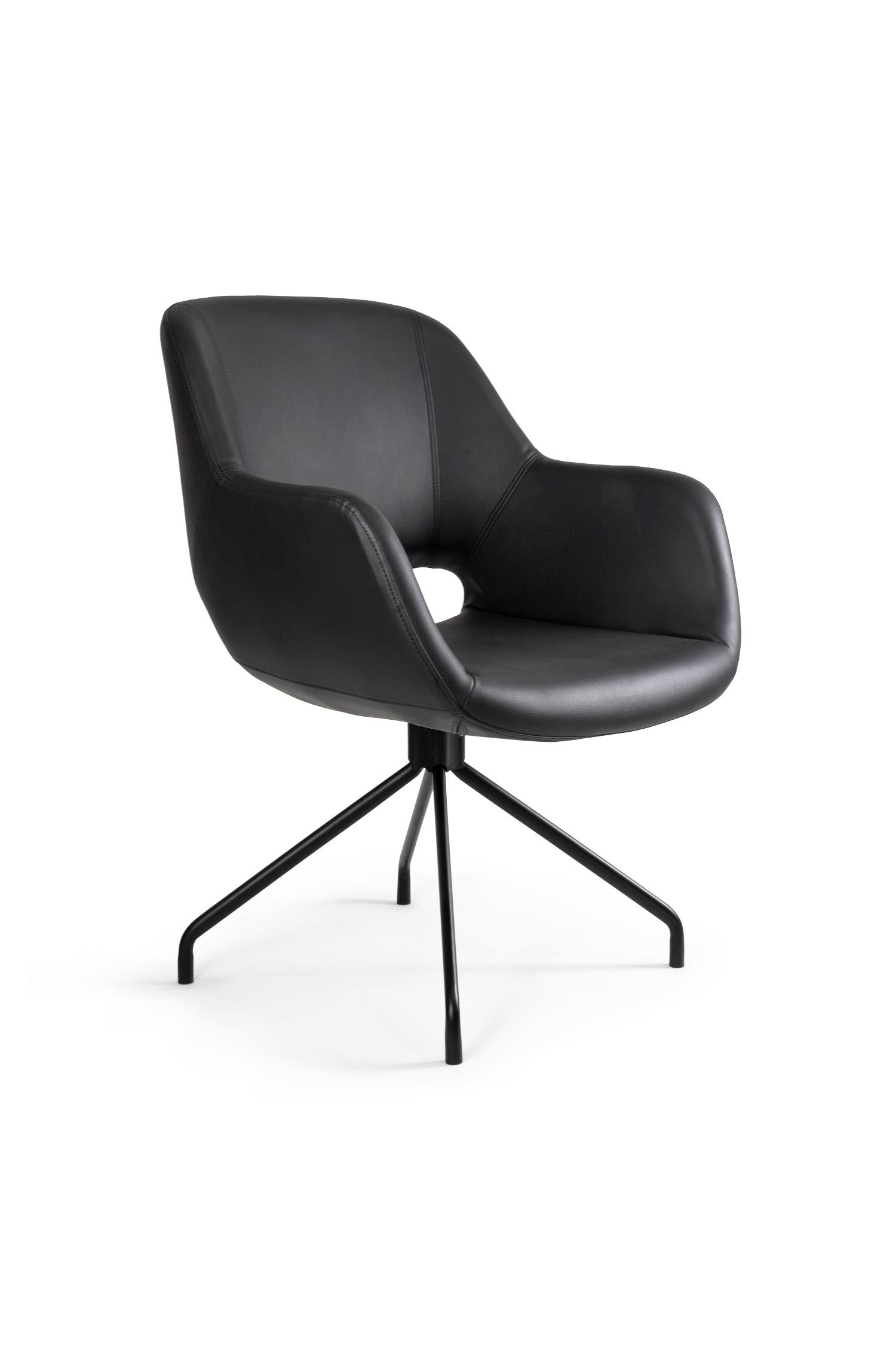 La base metálica de cuatro apoyos genera una presencia visual ligera pero firme, ideal para proyectos donde el diseño y la funcionalidad deben convivir sin exceso. Una opción sobria y profesional para ambientes corporativos bien definidos.
