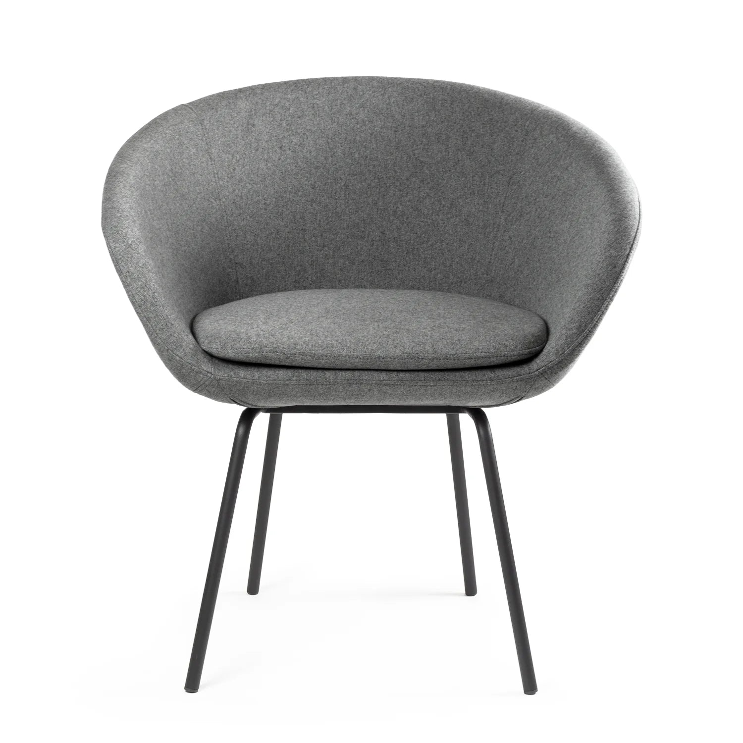 Silla lounge de visita con concha envolvente tapizada en tela gris y estructura de 4 patas metálicas en negro.
