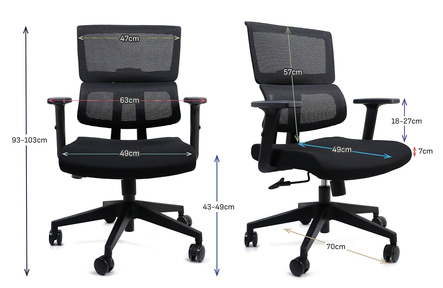 Silla ejecutiva ergonómica con asiento en tela negra y respaldo en malla transpirable con soporte lumbar ajustable.
